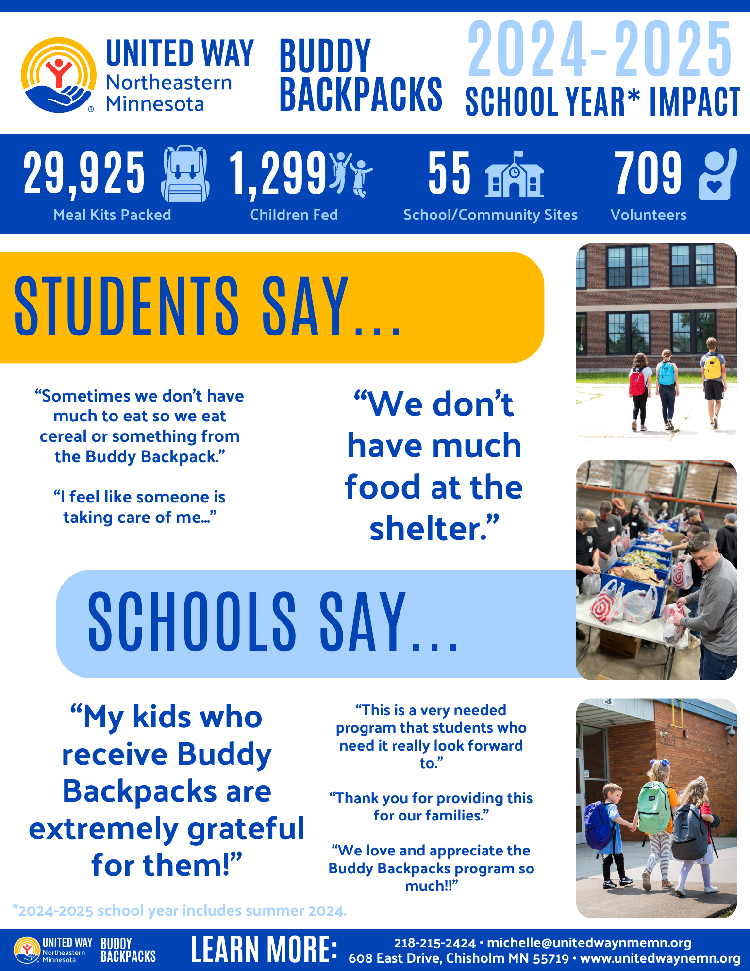 If your school is located in UWNEMN's service area, is not currently partnering with our Buddy Backpacks program, and would like to, please contact Community Impact Coordinator Michelle Lampton at michelle@unitedwaynemn.org or 218-215-2425.